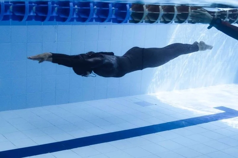 Often called the purest form of freediving, no-fins technique is similar to breaststroke, swimming horizontally in the pool or vertically down the line.